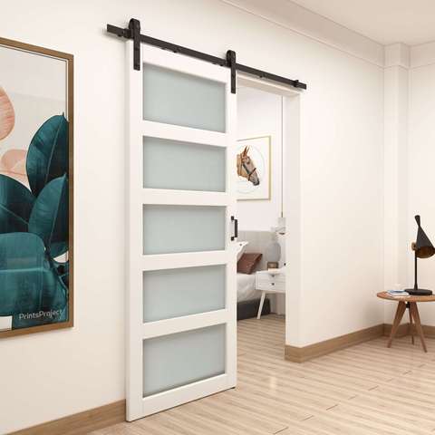Puerta de madera precolgada interior imprimada blanca de 5 paneles con herrajes para puertas corredizas de Granero